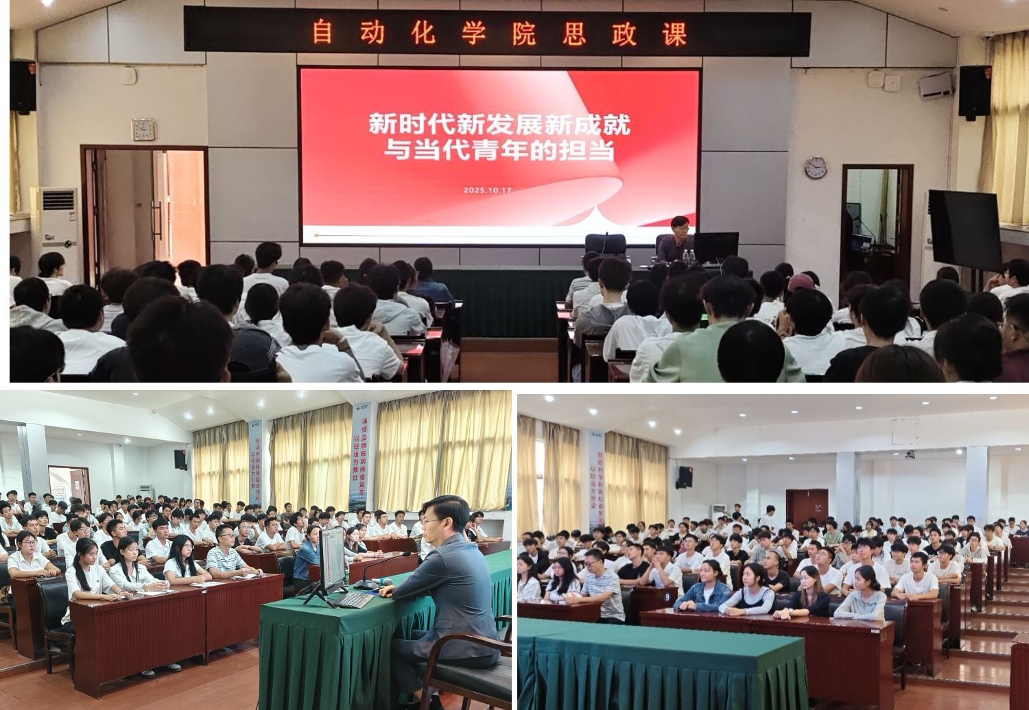 满海波的专题思政课以“新时代、新发展、新成就与当代青年的担当”为主题,围绕新时代新发展新成就、科技创新成就、中国经济特点以及“一带一路”与大国外交四大主题展开,紧密结合当前国家发展形势与自动化专业特色,引导学生深刻认识时代方位与个人使命。