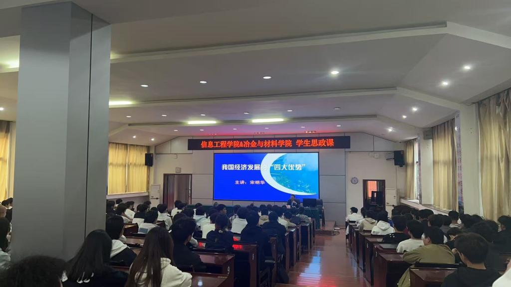 (冶材学院周官强、信息工程学院刘晓红)11月20日下午,党委书记宋明华走进冶金与材料学院(建筑工程学院)、信息工程学院,以“我国经济发展的四大优势”为题,为两院师生上专题思政课。勉励同学们关心国家大事,练就过硬本领与时代同频共振。