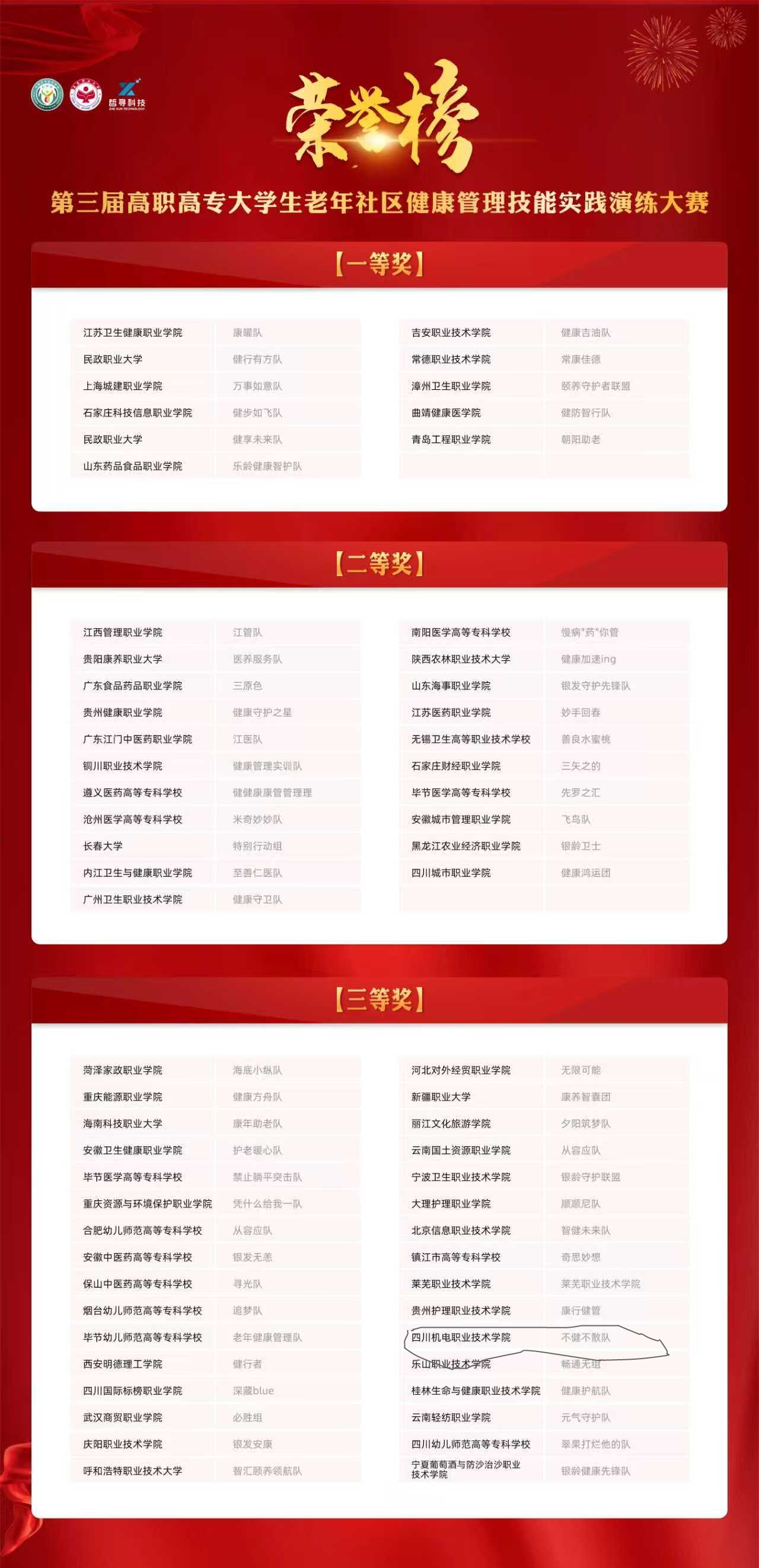 (管理学院 宋春蓉)近日,由中国老年医学学会主办的第三届高职高专大学生老年社区健康管理技能实践演练大赛圆满结束。我校管理学院健康管理专业邢洢,谭佳惠,肖程程3名学生组成的“不健不散队”奋勇拼搏,最终斩获三等奖,这是我校该专业第二次参赛并荣获全国赛事奖项。