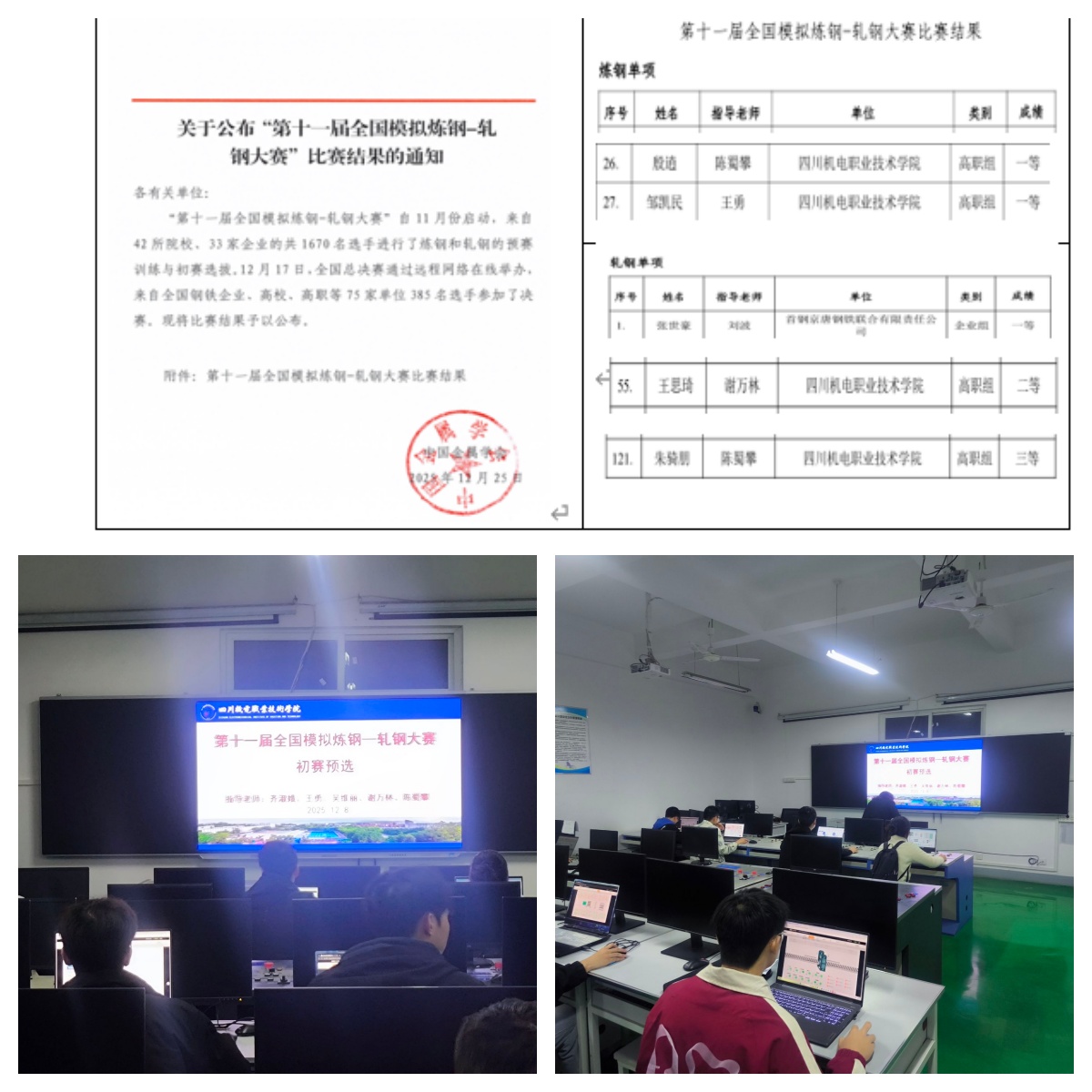 (冶材学院陈蜀攀、谢万林)12月25日,2025年第十一届全国模拟炼钢-轧钢大赛总决赛结果公布,冶金与材料学院钢铁智能冶金技术、材料成型及控制技术专业学生,在高职院校组炼钢仿真、轧钢仿真赛项中斩获2个一等奖、1 个二等奖、1 个三等奖。