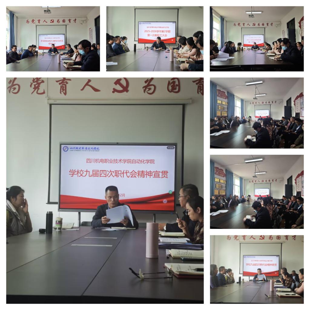 学院负责人向全体教职工传达了学校九届四次职代会精神,详细解读了学校工作报告中关于未来发展的战略规划,重点阐述了涉及人才培养、科研创新及综合改革等方面的决策部署。