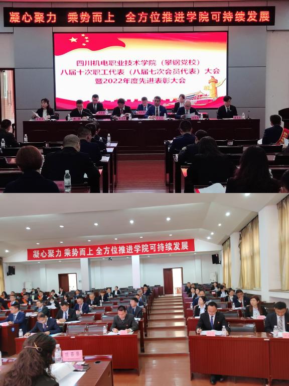 (综合管理部解晶)春日校园阳光明媚,火红攀枝花映红美丽校园,学院学术报告厅外墙张挂的大型横幅“聚焦立德树人根本任务,以高质量技术技能型人才服务经济社会发展”格外醒目,一楼大厅的大型条幅“凝心聚力,乘势而上,全方位推进学院可持续发展”凸显会议主题。新学期开学前夕,2月16日上午,学院(攀钢党校)八届十次职工代表(八届七次会员代表)大会暨2022年度先进表彰大会,在学术报告厅一楼大厅隆重召开,60余名教职工代表济济一堂,共商学院发展大计。大会主席团成员宋明华、王光涛、陈勇、龙华洲、姚春早、满海波、刘松青、杨春城、荆永月在主席台就坐。党委副书记、纪委书记、工会主席陈勇主持会议。