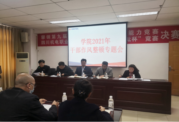 11月22日下午16:00,学院在三会议室召开2021年干部作风整顿专题会。学院领导班子成员、各系部负责人及相关管理人员60人参会。