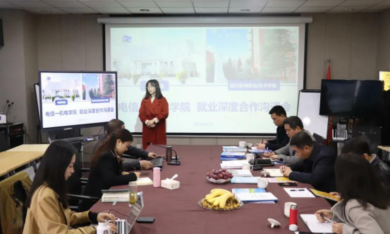各方在科园教育多媒体三教室就业务合作展开深入交流。杨磊副总介绍了科园教育(科园学院)的成立背景、业务板块、人才培养理念与体系;电信成都分公司人力资源部介绍了分公司背景,2021年面向高职院校的招聘需求及员工职业发展通道等情况。