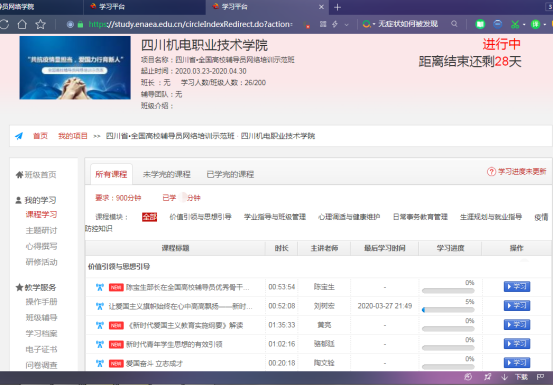 (学生处刘瑶报道) 近日,为深入贯彻落实习近平总书记系列重要指示精神和党中央决策部署,增强辅导员在疫情防控背景下做好学生思想政治教育工作的能力,按照四川省教育厅转发《关于举办全国高校辅导员网络培训示范班的通知》要求,学工部周密安排,精心组织我校全体专职辅导员参加了主题为“共抗疫情显担当,爱国力行育新人”的全国高校辅导员网络培训示范班学习。