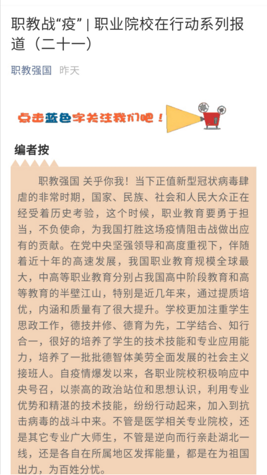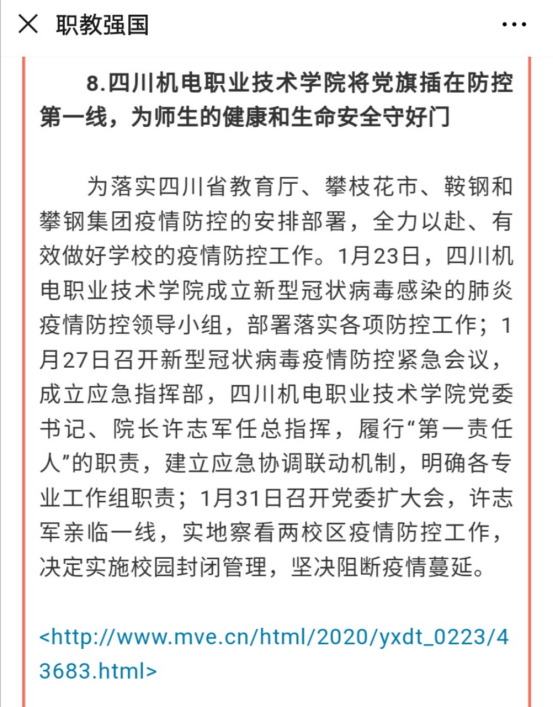 【媒体看学院】职教强国公众微信号刊登《学院将党旗插在防控第一线,为师生的健康和生命安全守好门》一文