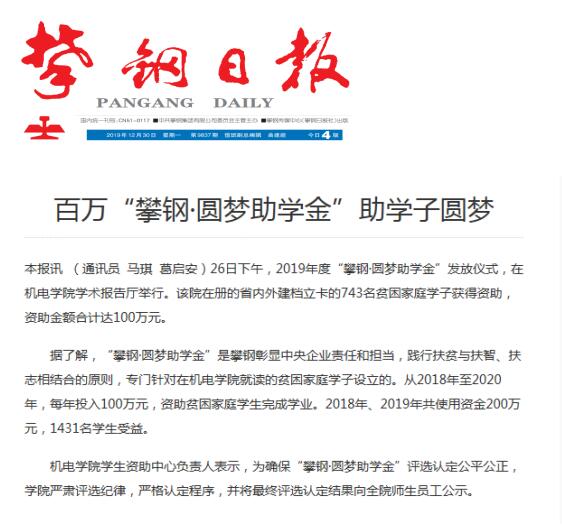 2019年12月30日,《攀钢日报》刊登学院新闻《百万“攀钢·圆梦助学金”助学子圆梦》