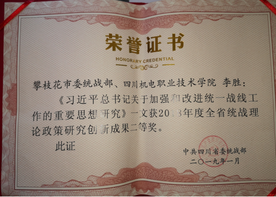 (综合管理部葛启安报道)近日,2018年统战理论政策研究创新成果、统战工作实践创新成果评奖揭晓。我校获统战理论政策研究创新成果二等奖一项,三等奖一项,其中李胜的《习近平总书记关于加强和改进统一战线工作重要思想研究》获二等奖,黎定政、荆永月的《提高党外知识分子思想政治工作的针对性实效性问题研究》获三等奖。