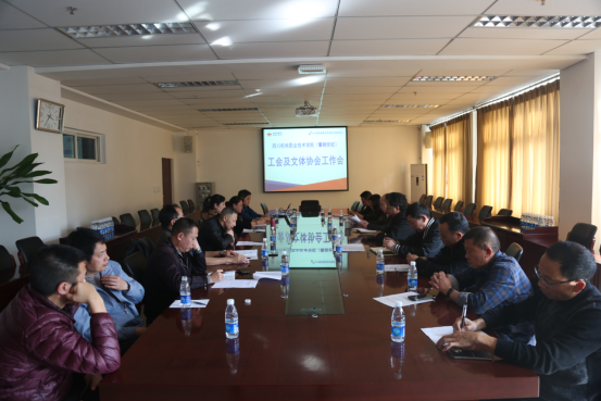 (综合管理部葛启安)1月14日,学院工会组织各分工会及有关文体协会学习工会十七大精神,总结交流2018年工作。学院党委副书记、纪委书记、工会主席王天堂参加会议并对2019年工会工作提出要求,工会副主席贺永德主持会议,领学了《攀钢关于加强和改进工会工作的意见》,学院各分工会主席及各协会会长参加会议。