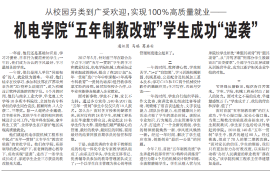 【媒体看学院】《攀钢日报》12月10日三版头条刊登《学院机械工程系“五年制教改班”学生的成功逆袭》