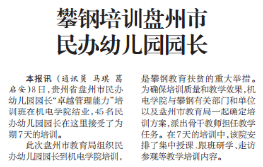 【媒体看学院】《攀钢日报》12月10日头版刊登《盘州民办幼儿园园长在学院培训班在学院开班》