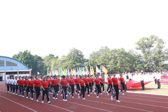 教职工以饱满的精神面貌阔步走过主席台,他们由内而外散发出来的运动精神,充分展示出了教师别样的风采和对运动的热情。