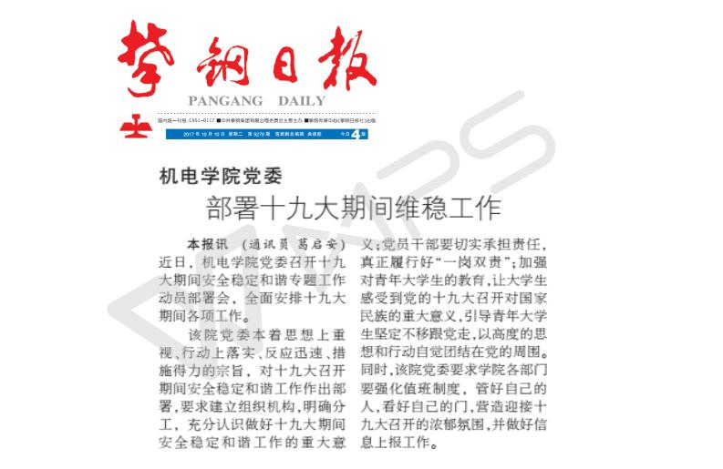 【媒体看学院】2017年10月10日《攀钢日报》刊登《机电学院党委部署十九大期间维稳工作》