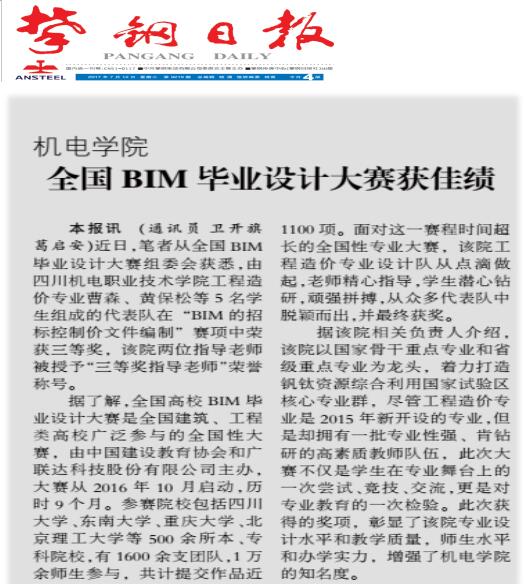 2017年7月12日,《攀钢日报》刊登《机电学院师生在全国高校BIM毕业设计中获佳绩》