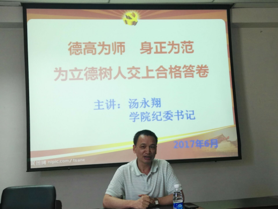 汤书记希望全体老师秉承习总书记的教育重托,承担起教育的重大责任,自觉抵制社会上各种诱惑,树立良好的党员形象、教师形象,为立德树人交上合格答卷。