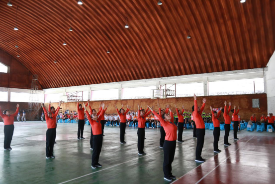经过认真的赛前准备,参赛队员们迈着矫健的步伐走进体育馆,精神饱满,身着色彩斑斓的服装,美不胜收;伴随着充满活力和动感的广播操音乐,各分工会运动员依次亮相,每一队在比赛中,由预备节开始,从第一节伸展运动到第二节扩胸运动,从第三节踢腿运动到第四节体侧运动,从第五节体转运动到第六节全身运动,从第七节跳跃运动到第八节整理运动。整齐划一的队伍、流畅舒展的身姿、刚劲有力的动作以及响亮口号,无不展示着学院职工的运动活力和蓬勃风采。