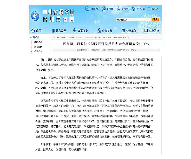 【媒体看学院】2017年5月24日《四川教育网》刊登《学院召开党委扩大会专题研究党建工作》