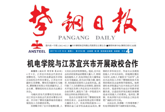 【媒体看学院】《攀钢日报》头版报眼位置刊登《机电学院与江苏宜兴市开展政校合作》