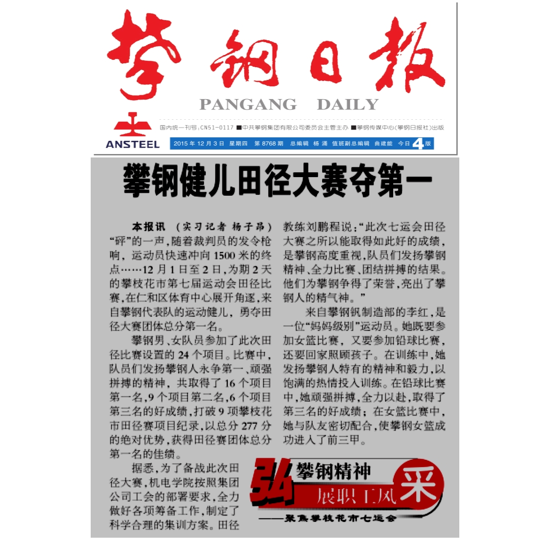图为2015年12月3日,《攀钢日报》头版报道《攀钢健儿田径大赛夺第一》(图 综合管理部)