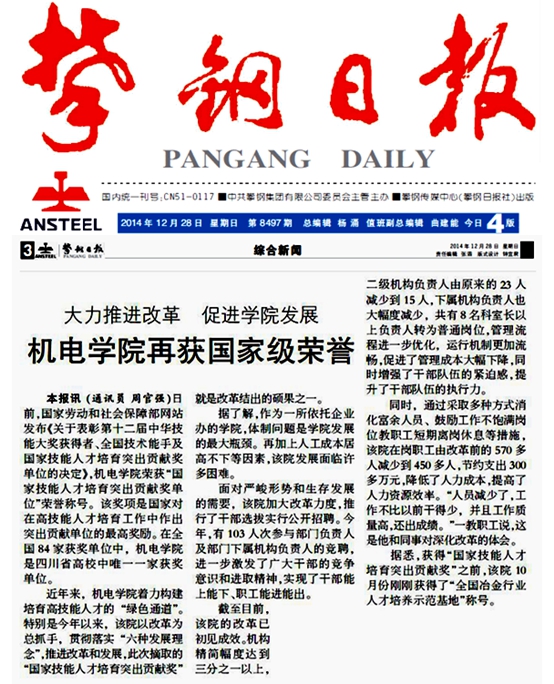 图为12月28日《攀钢日报》第三版刊登《机电学院再获国家级荣誉》