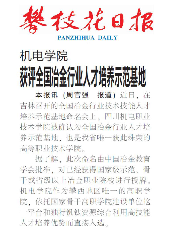 图为《攀枝花日报》要闻版刊登《机电学院获评全国冶金行业人才培养示范基地》