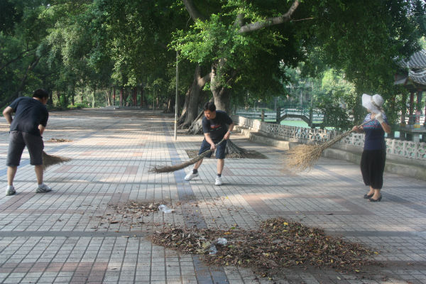 该图为党委副书记、工会主席袁雪良带领小组打扫现场。