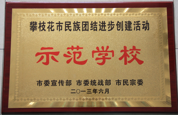 本站讯(马琪报道)日前,学院在由中共攀枝花市委宣传部、统战部,攀枝花市民委联合开展的“民族团结创建活动”中,因成绩突出,被授予“民族团结创建活动示范学校”称号,并颁发牌匾。