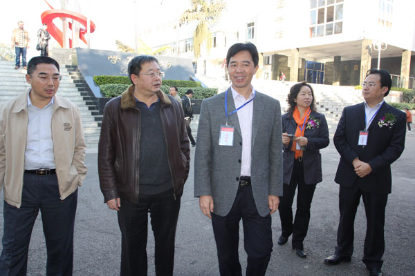 图为开幕式后许志军(前右一)陪同出席开幕式的领导参观校园。左一为袁雪良。