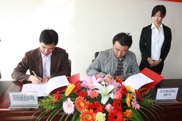 | 图为院长、党委书记许志军(左)与德昌县高级职业中学副校长何朝书代表双方签约。 |