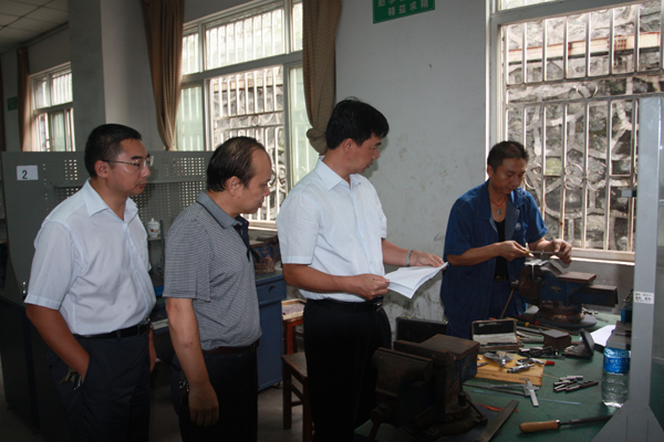 图为院领导许志军(右二)、袁雪良(左一)、程龙泉(左二)等巡视钳工实做赛场。