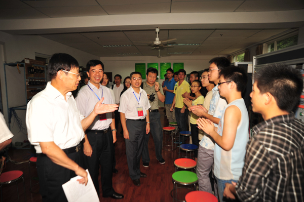 图为索丽生(右一)等在参观实训实验室。