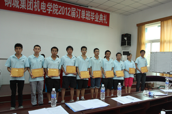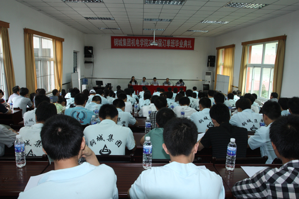 本站讯(张跃华报道) 7月3日下午, 钢城集团机电学院2012届订单班毕业典礼在我院三教学楼309举行,副院长程龙泉出席典礼并讲话,祝贺2012届订单班顺利毕业。钢城集团副总经理胡建新对2012届订单班学生表示欢迎。招生就业处、教务处等部门负责人参加会议。钢城集团人力资源部何璧聿主持毕业典礼。2012届订单班学生参加典礼。