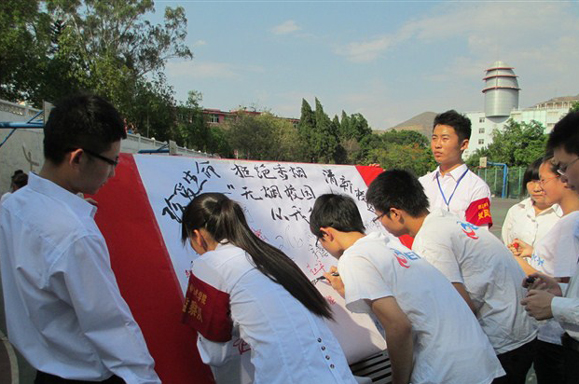 无烟月启动仪式上,学生代表在“无烟校园、从我做起”签名板上签名,支持无烟校园建设。
