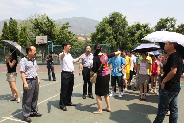 图为许志军、程龙泉(左一)、张英民(右一)到马家田校区应急避难所看望慰问参加演练的师生员工。