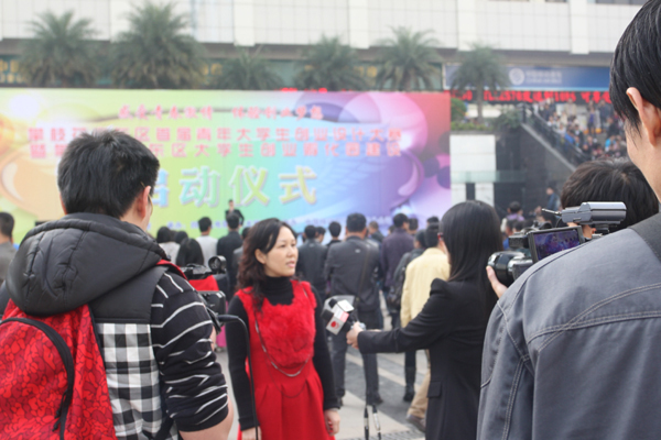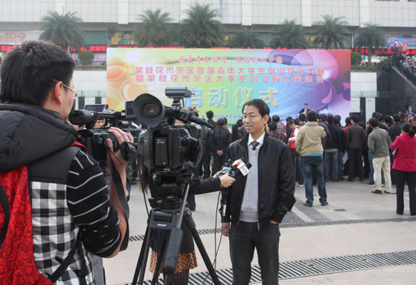 图为大赛和孵化园领导小组办公室负责人,学院管理工程系总支书记、系主任黄伟在启动仪式现场接受攀枝花市、攀钢媒体的联合采访,介绍了大赛的有关情况。