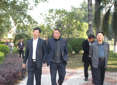 图为报告会结束何云庵教授(中)在许志军(左)、袁雪良(右)等陪同下参观校园。