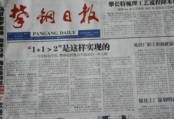 本站讯(马琪报道)11月8日出版的《攀钢日报》在头版头条刊发长篇通讯——《“1+1>2”是这样实现的——写在机电学院、攀钢党校整合平稳运行一年之际》,详细报道学院、攀钢党校整合运行一年来的情况。另外,11月7、8、9日,攀钢电视台《攀钢新闻》栏目也连续3期播发新闻《机电学院、攀钢党校教育资源整合实现“1+1>2”》专题新闻。