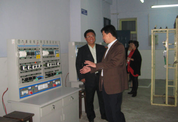 图为许志军(右)在了解电气实训实验室的建设运行情况。