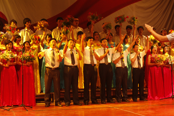 本站讯(马琪、张跃华、学生记者沈诗成)9月14日、15日晚,学院在马家田、金江校区体育馆举行盛大晚会,欢迎2011级新同学。党委书记、院长许志军带领学院领导班子全体成员熊斌、袁雪良、程龙泉、张英民、李胜登上舞台与合唱团同学一起演出。学院各系部和有关职能部门负责人,近2300名2011级新生分别在两大校区观看演出。