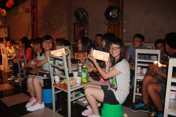 看我们的月饼多精美!图为信息工程系新生在晚会上。