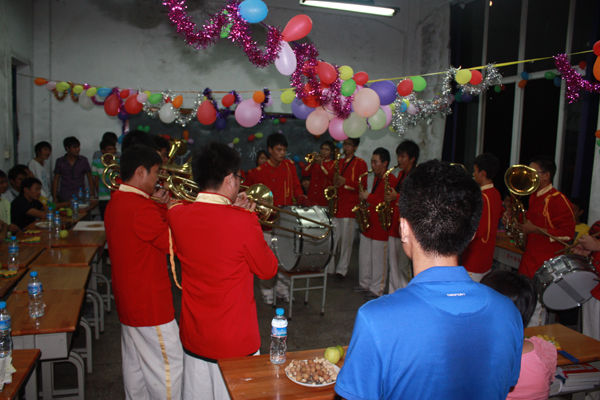 | 图为学生管乐队到电子电气工程系个新生班级巡回表演。 |