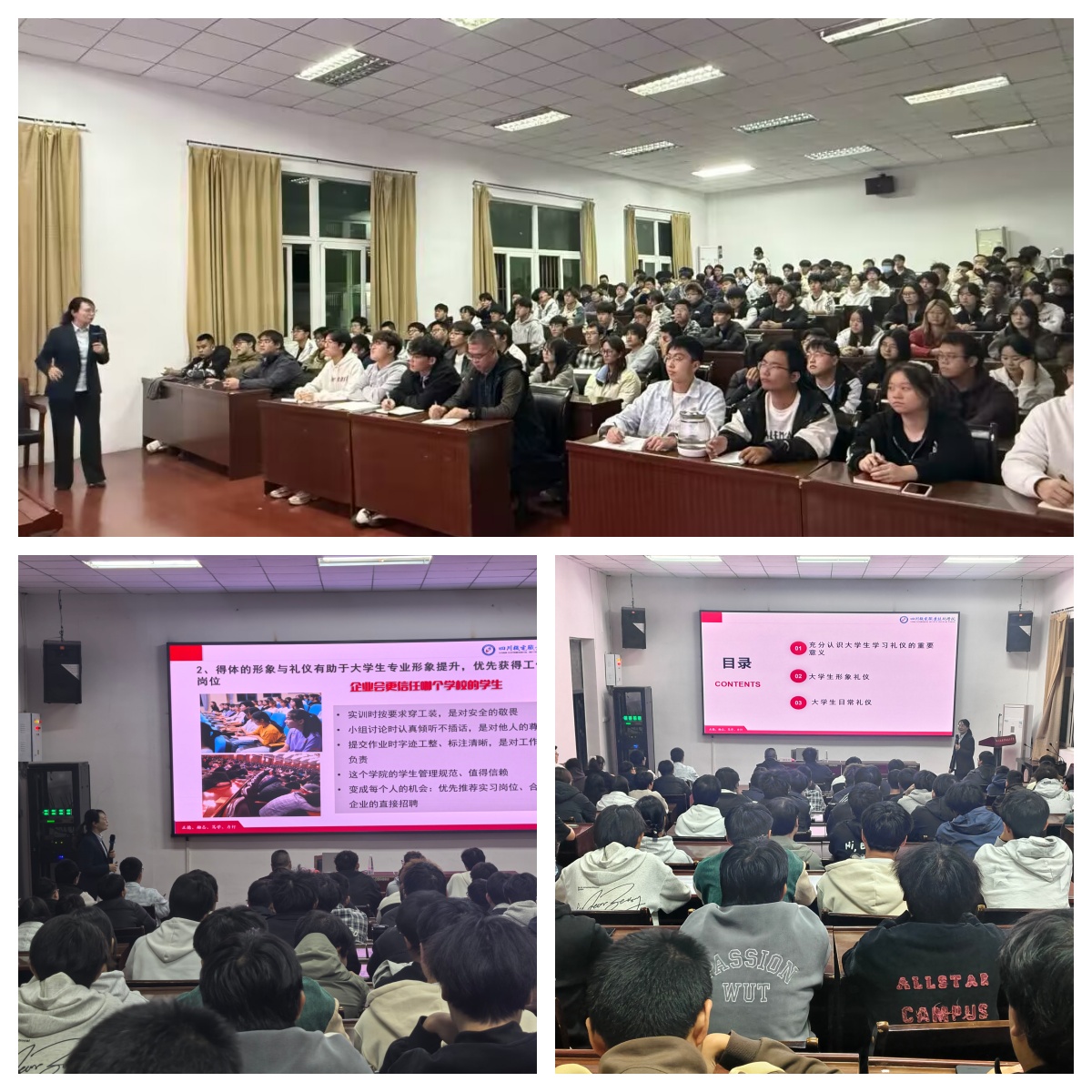 (自动化学院学生李泽坤 王玉梅)为提升大学生综合素养,塑造新时代大学生良好精神风貌,11月23日晚,自动化学院在二教309阶梯教室大学生礼仪的专题讲座,邀请管理学院荆永月老师主讲。该学院2025级2个卓越班学生及该院部分学生干部参加讲座。