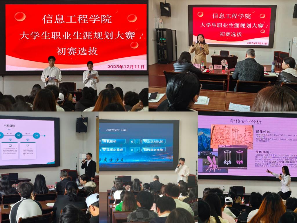 (信息工程学院李军、丁梅 学生王可)为提升学生职业规划意识,引导同学们树立正确的成长成才观与择业就业观,筑牢高质量就业根基,12月11日下午,信息工程学院在二教 309 举办“信筑青春梦 职启未来程”大学生职业规划大赛决赛。