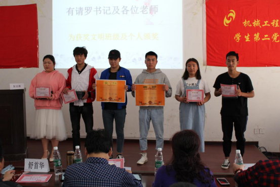 机械二支部书记和各位辅导员为获奖班级、个人、优秀寝室进行颁奖。