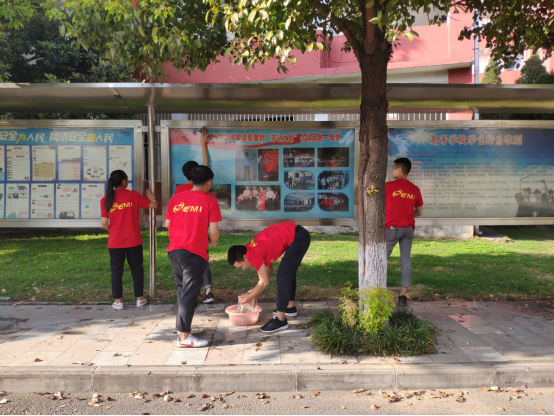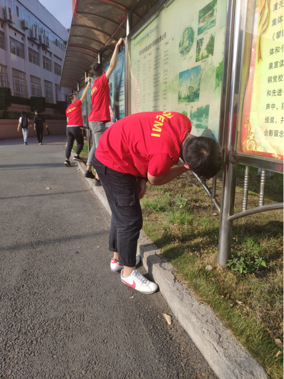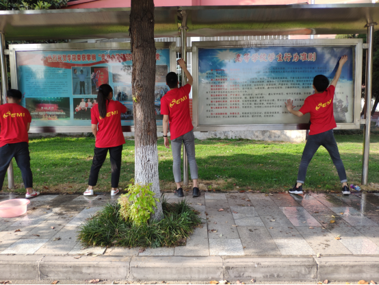 下课后,志愿者们自发组织起来,拿着抹布和水桶,清理橱窗的灰尘。志愿者们忙的不亦乐乎,将学院各处的橱窗打扫得干干净净,使校园面貌焕然一新。
