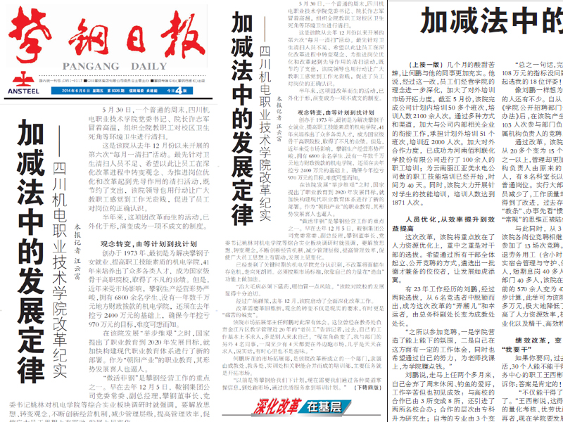 6月6日(今日),《攀钢日报》头版刊载攀钢报社记者汪云富所写《加减法中的发展定律——四川机电职业技术学院改革纪实》一文。图为刊载情况截图。(阿官编辑)