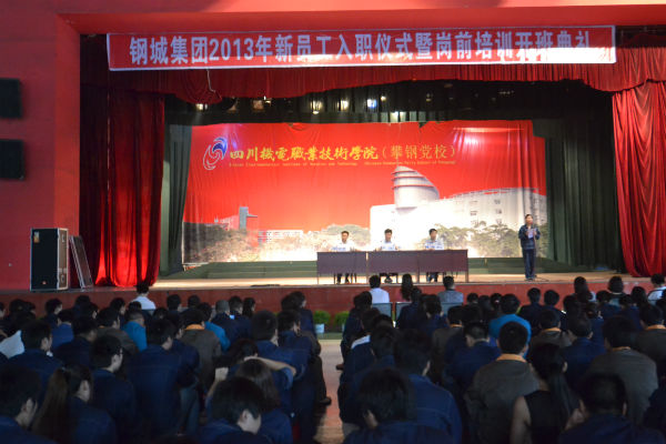 本站讯(彭彬秀、张跃华报道)2013年7月18日上午9:00,钢城集团2013年新员工入职仪式暨岗前培训开班典礼在学院风雨操场如期举行,300名2013年入厂的钢城集团新员工参加了入职仪式,近100名新分大学生参加岗前培训开班典礼,学院院长助理、攀钢党校副校长李胜、市人力资源和社会保障局副局长谭克、市就业局常务副局长邓鸿、市农劳办主任康开武、钢城集团公司党委书记、常务副总经理王继光等领导及钢城集团人力资源部和学院有关部门负责人参加了入职仪式及开班典礼。李胜主持入职仪式及开班典礼