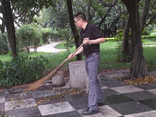 由于前一天晚上下了场大雨,校园各处都是厚厚的落叶、大量的积水,叶子粘在地上难以清扫,灌木丛里全是水,这给大扫除带来了更艰辛的环境,修剪灌木的许志军、李胜等一组最为辛苦,全身都被灌木丛里的雨水打湿了,大扫除中大家不怕脏不怕累,经过一上午的辛勤劳动,校园焕然一新。