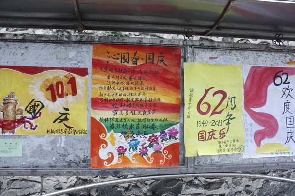 本站讯(马琪报道)在国庆62周年即将到来之际,院团委学生工委、学生青年志愿者协会、院学生会、管理工程系团总支和学生会、电子电气工程系第一学生党支部学生党小组和学生会、机械工程系团总支和学生会、材料工程系学生会等学院和系部学生组织自己动手,制作“‘迎庆国庆’专题海报”,在学院马家田、金江校区宣传栏张贴,祝福伟大祖国62华诞!学院基础部专门制作“国庆62周年专题橱窗”,热情讴歌伟大祖国,表达师生员工的爱国之情!