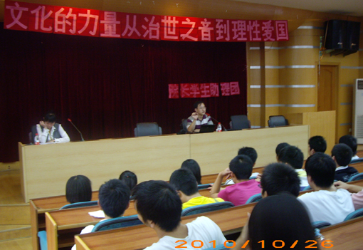 本站讯(学生记者王小丽 王皓民 张靖报道)26日下午,应电子电气工程系学生党支部邀请,学院管理工程系周官强老师在院学术报告厅为学生作“文化的力量——从治世之音到理性爱国”专题讲座。